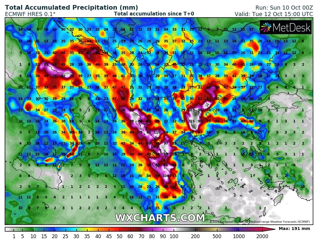 Várhatóan Görögországban az esőzés kedden szűnik majd meg, így addig további 70-150mm csapadék zúdulhat le, de kisebb körzetekben 200mm-t megközelítő sem kizárt.