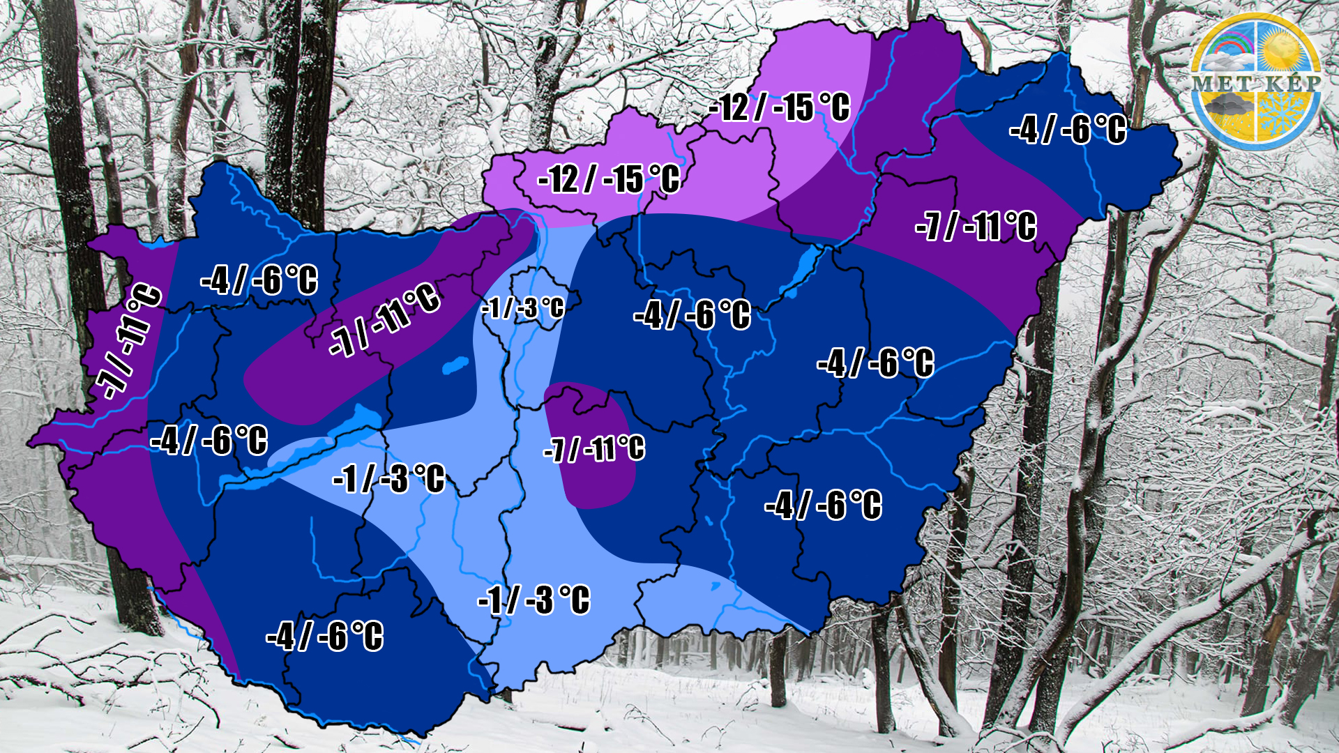 Napnyugta után gyors hőmérsékletcsökkenésre kell számítani. Reggelre pedig a kevésbé felhős, szélcsendes helyeken -5 fok alá csökkenhet a hőmérséklet, sőt a havas területeken -10 fok körüli, a fagyra érzékeny területeken pedig -10 foknál hidegebb is lehet ( főleg Északi-kh környéke). Északkeleti határnál maradhat a borult, felhős idő, kisebb havazás sem kizárt. Nagyjából a Duna mentén szeles maradhat az idő, ráadásul ott ( a Dunakanyart leszámítva) nincsen hó, így -1,-3 foknál hidegebb nem valószínű)