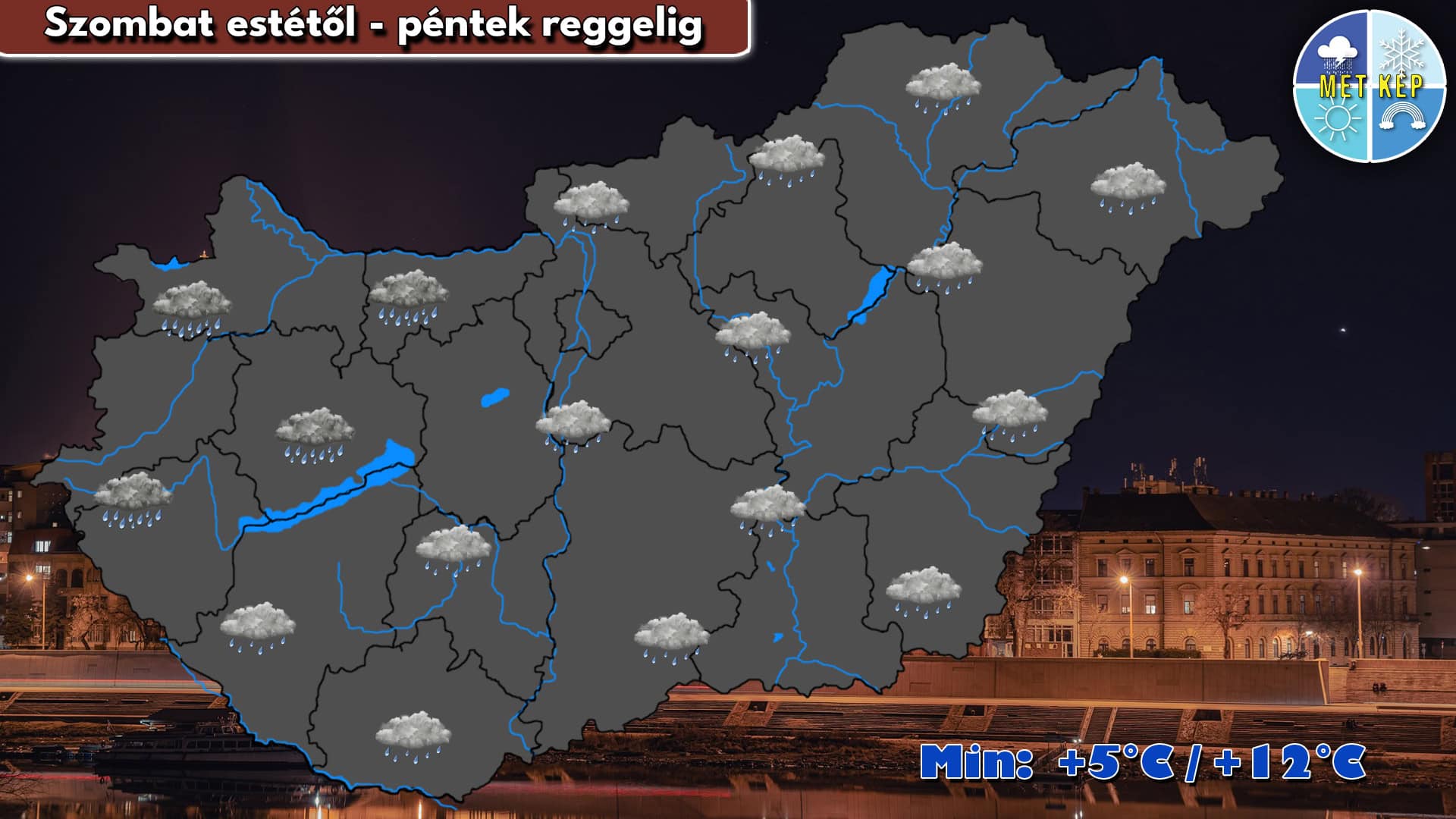 Estétől nyugat, északnyugat felől egyre vastagabb felhőtakaró érkezik, és többfelé alakulhat ki eső, zápor. A szél mérsékelt marad. A legalacsonyabb hőmérséklet 5 és 12 °C között alakul.