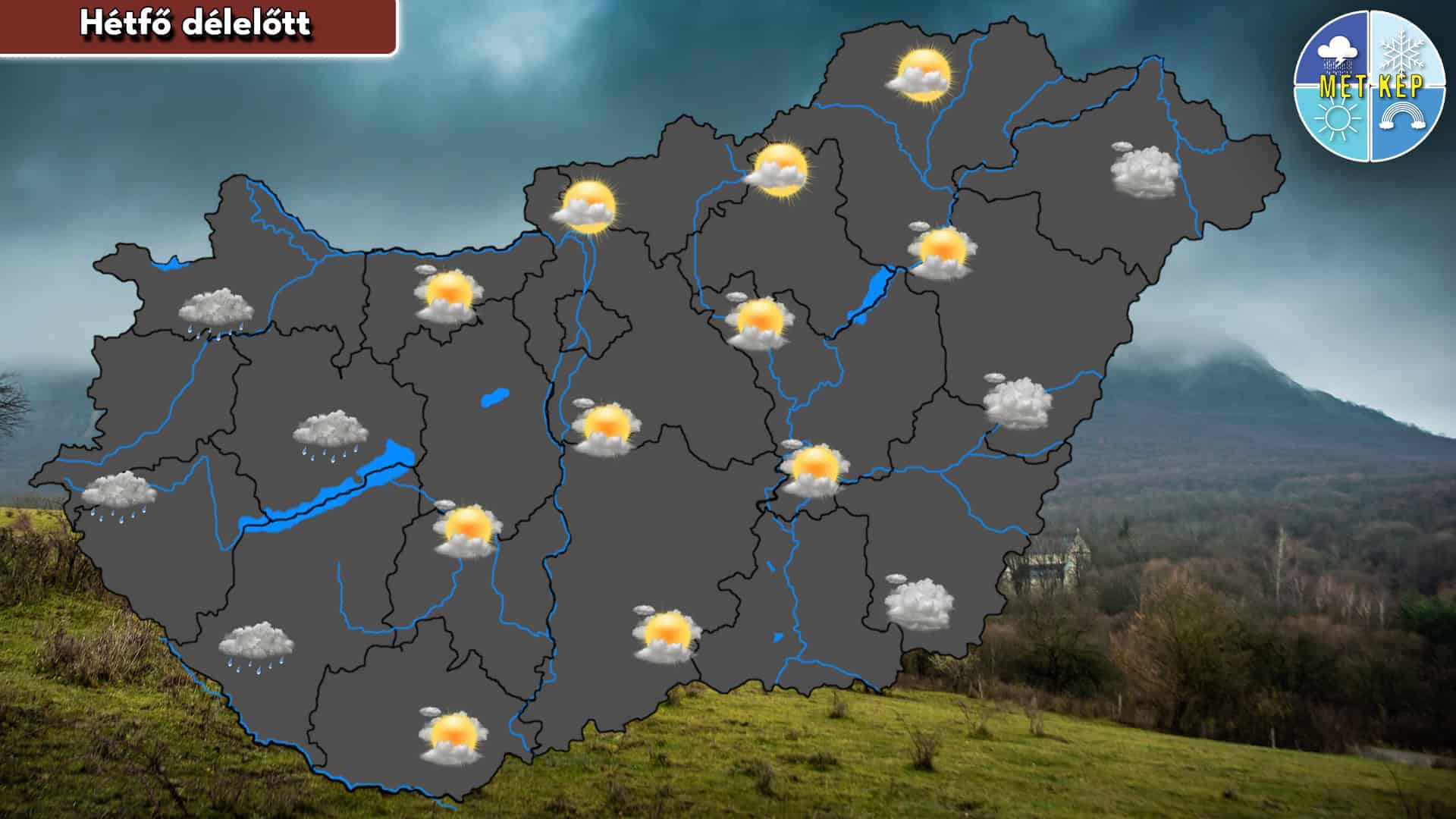 Az ország nagy részén erősen felhős, borult időre számíthatunk. A Dunántúlon eső, záporeső is kialakulhat. A szél mérsékelt, helyenként élénk lesz.