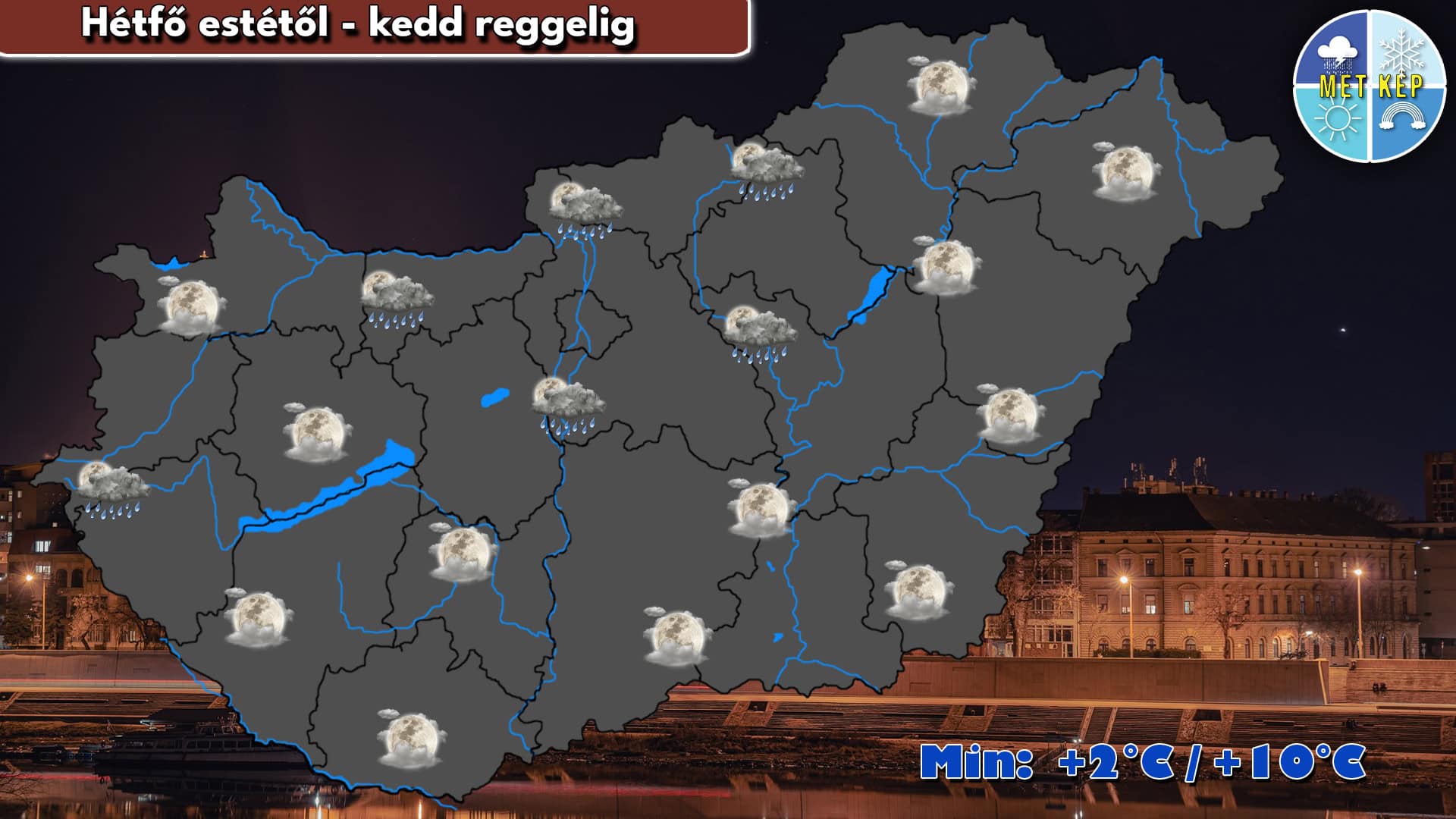 Az éjszaka folyamán is marad az erősen felhős, borult égbolt. Szórványosan még előfordulhat futó záporeső. Az északnyugati szél többnyire mérsékelt, helyenként élénk lehet. Hajnalra a hőmérséklet 2 és 10 °C közé csökkenhet.