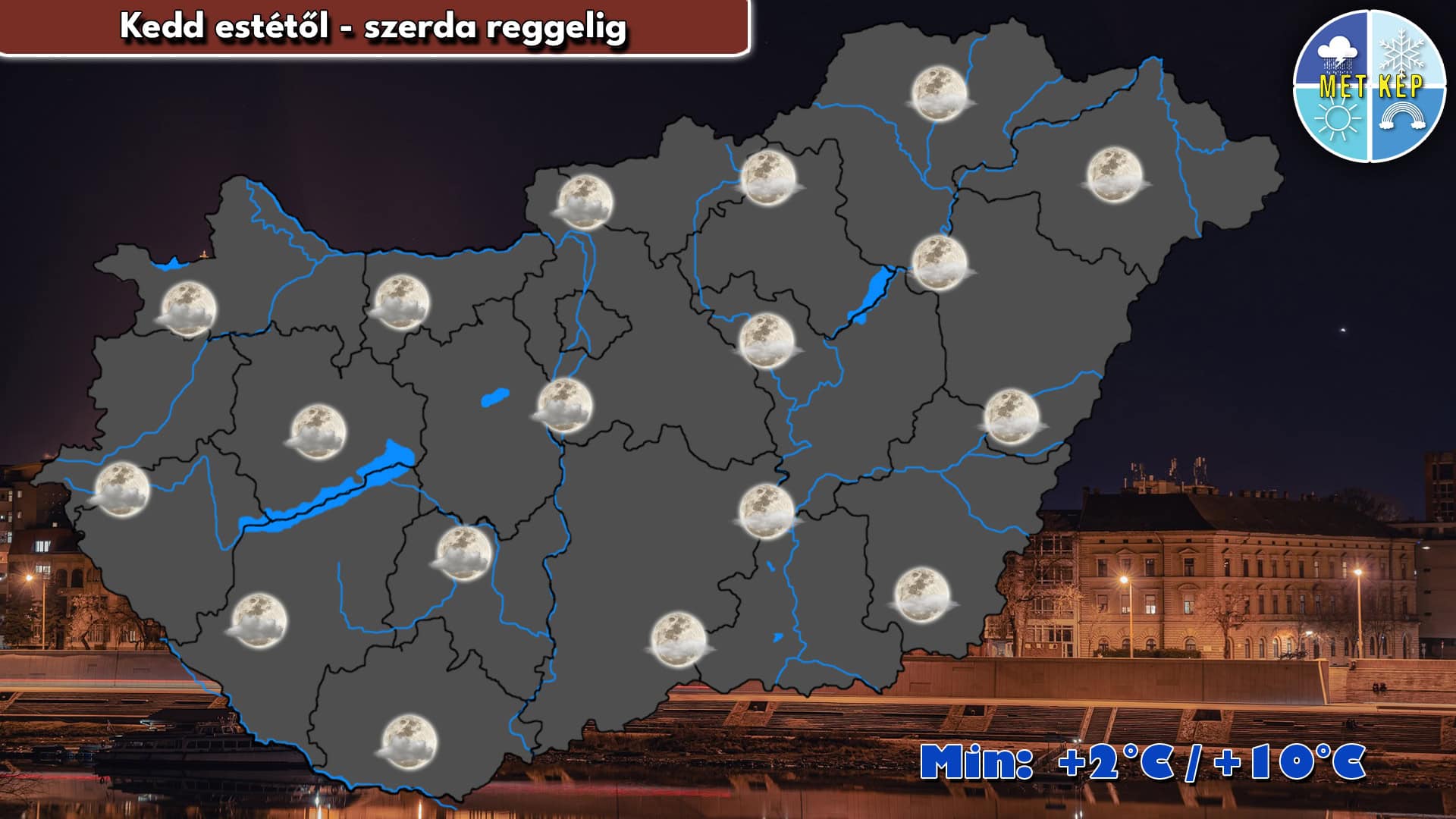 Az éjszaka folyamán keleten fokozatosan csökken a felhőzet, míg nyugaton változóan felhős lesz az ég. A szél mérséklődik. A legalacsonyabb hőmérséklet 2 és 10 °C között várható.