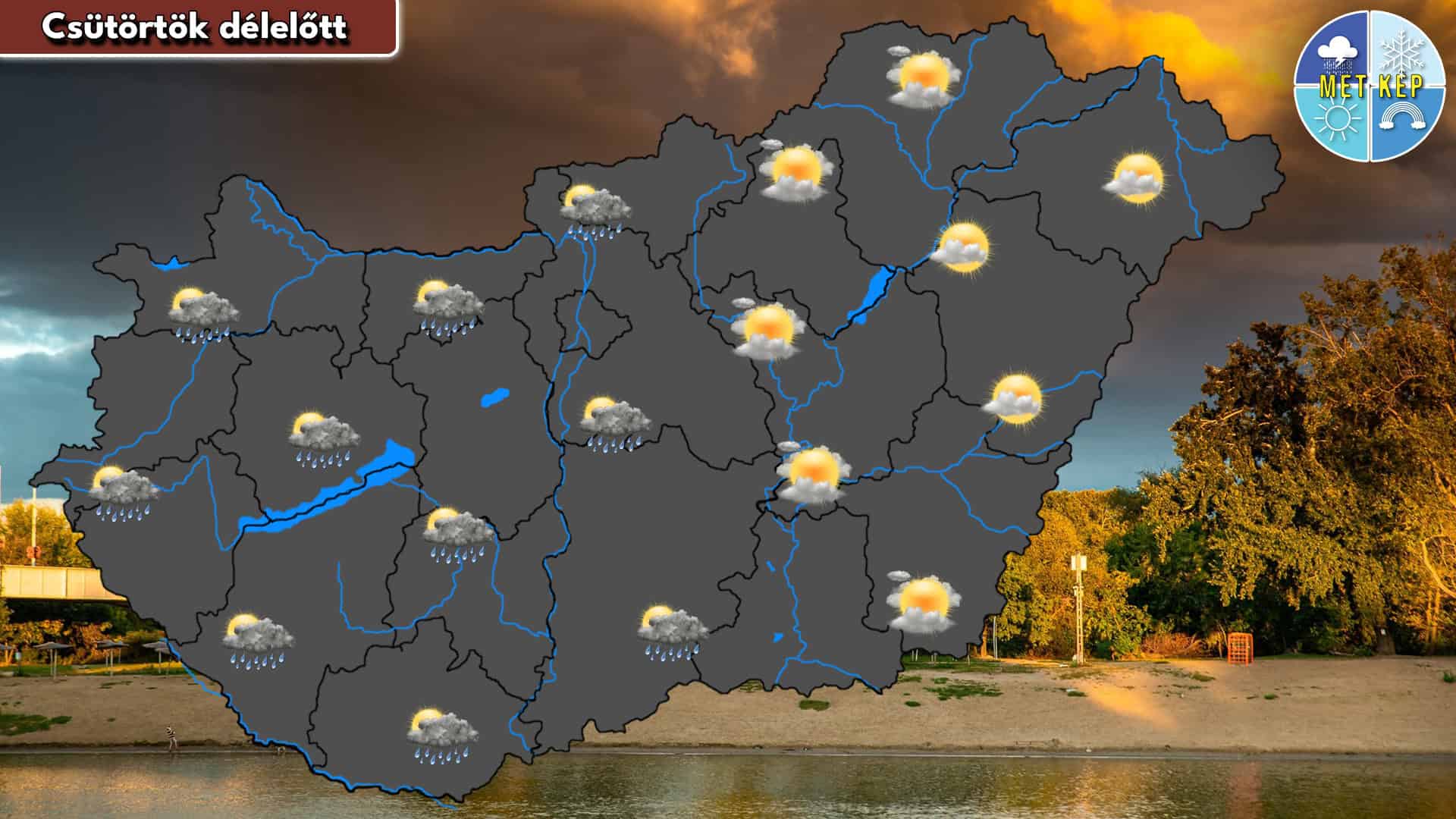 A délutáni órákban a Dunántúlon és a középső területeken továbbra is előfordulhat záporeső, míg északkeleten változóan felhős lesz az ég. A szél többnyire mérsékelt, helyenként élénk lesz. A legmagasabb hőmérséklet 12 és 18 °C között alakulhat.