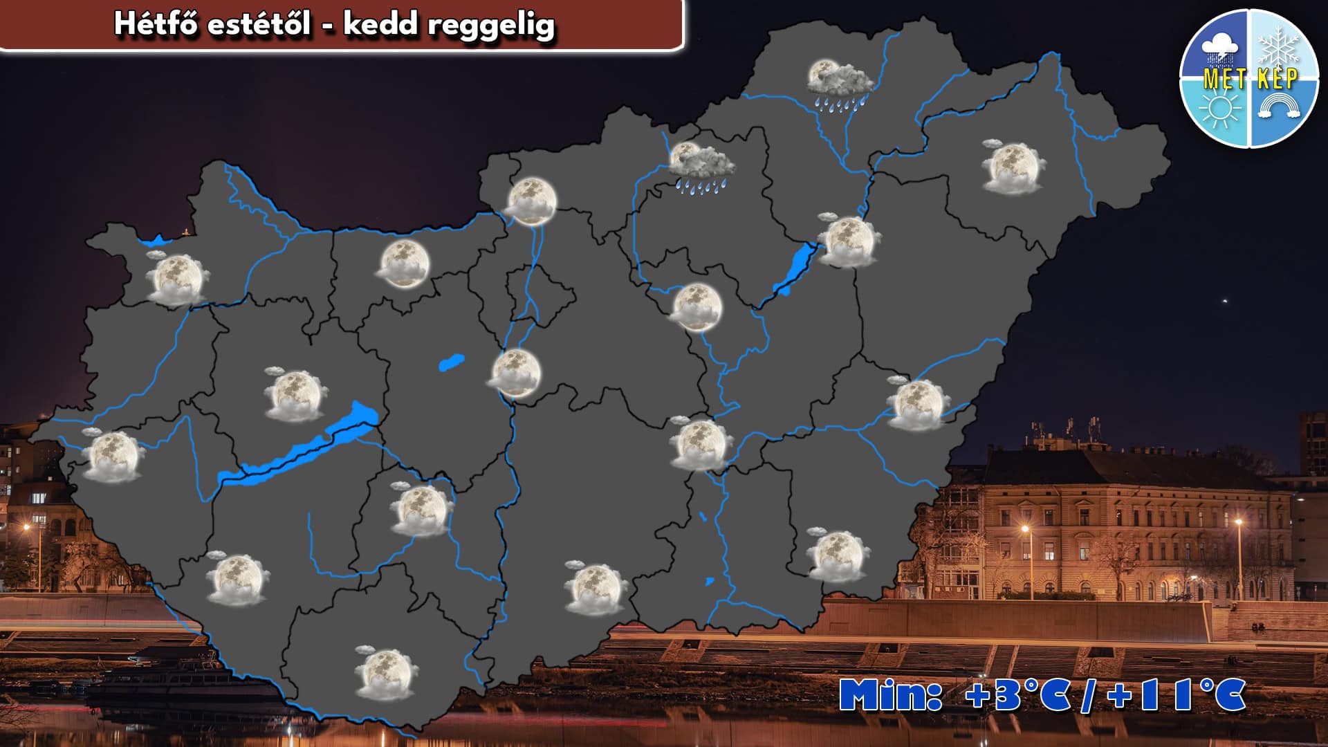 Az esti órákban északkeleten még előfordulhat egy-egy futó zápor, de alapvetően közepesen vagy erősen felhős időre van kilátás. A szél gyenge lesz. Hajnalra a hőmérséklet 3 és 11 fok közé csökkenhet.