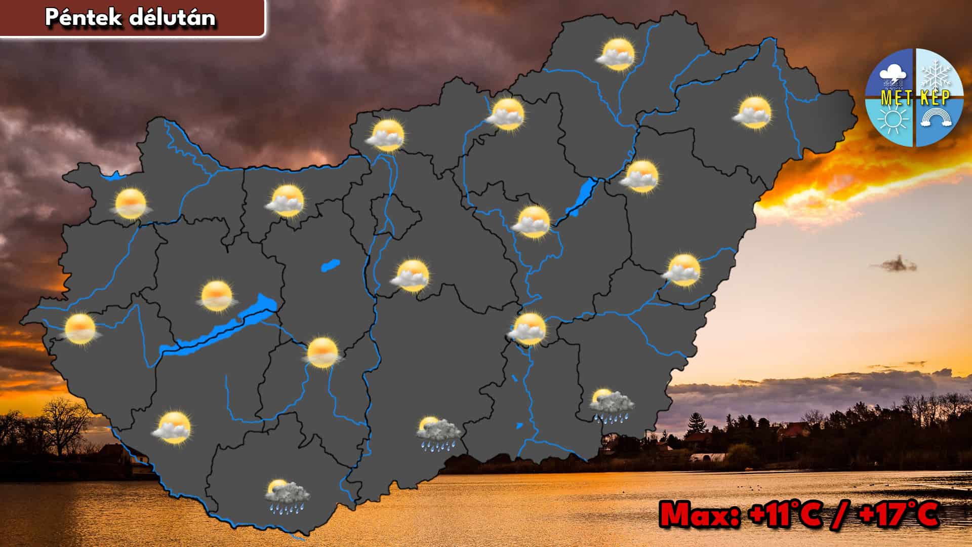 Délutánra tovább csökkenhet a felhőzet, gyengén, illetve közepesen felhős lehet az ég. A déli tájakon a felhőátvonulásokból futó záporeső is előfordulhat. Többfelé élénk, helyenként erős lesz az északnyugati szél. A legmagasabb hőmérséklet 11 és 17 fok között alakulhat.
