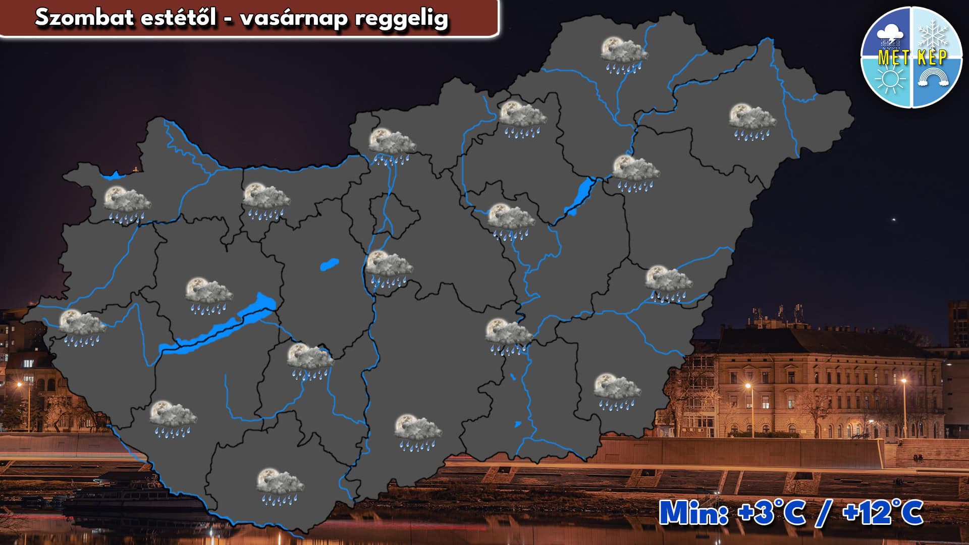 Az éjszaka folyamán megnövekszik a felhőzet, többfelé borult lesz az ég. Az esti óráktól egyre több helyen várható eső, zápor, néhol zivatar sem kizárt. A szél gyenge lesz. Hajnalban a minimum hőmérséklet 3 és 12 fok között valószínű.