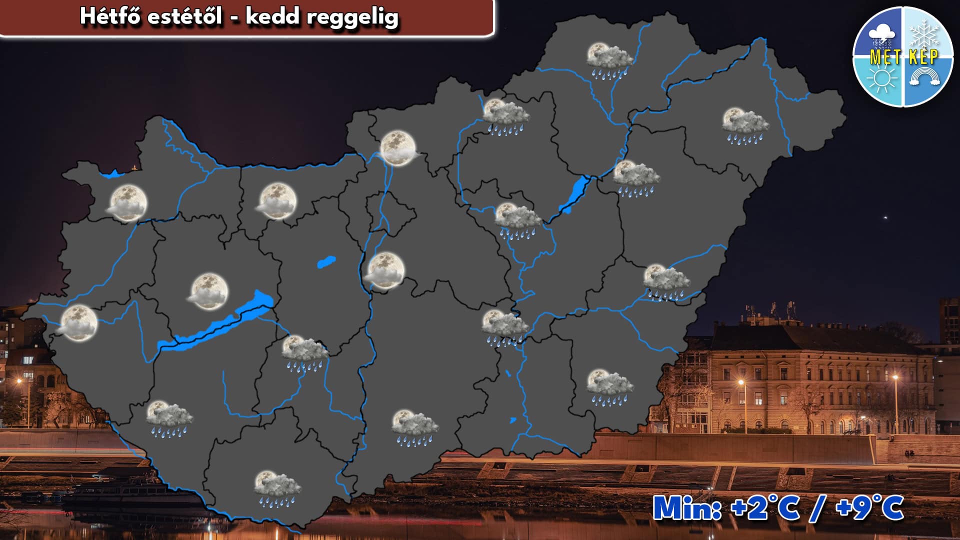 Az éjszaka folyamán a déli és keleti országrészekben eső, záporeső valószínű. A légmozgás többnyire mérsékelt, néhol élénk lehet. A hőmérséklet hajnalra 2 és 9 fok közé csökkenhet.