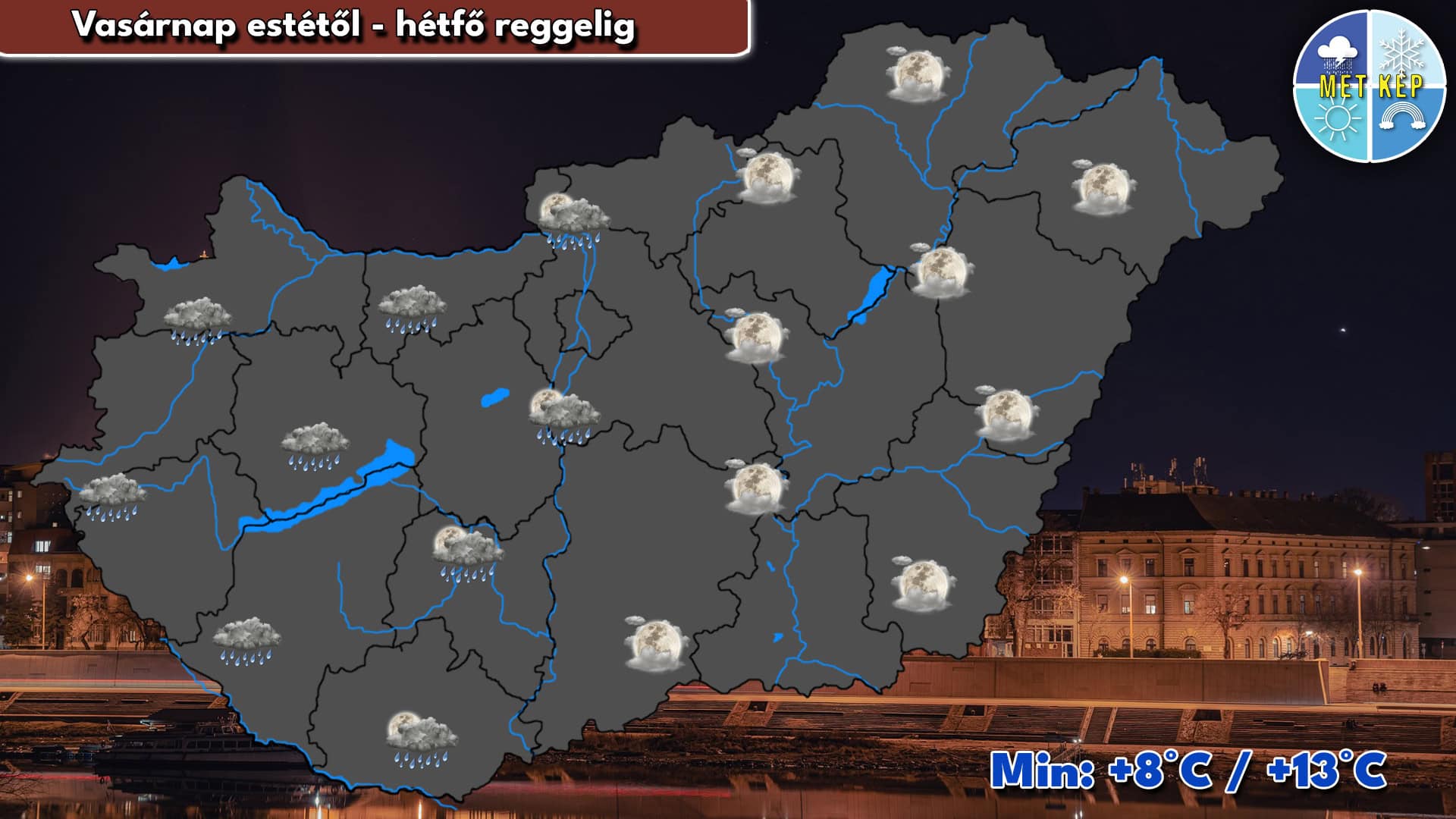Az esti órákban nyugat felől csapadékzóna éri el térségünket, amely a nyugati országrészben egyre többfelé okozhat esőt, záport. Az éjszaka folyamán a csapadék a Duna vonaláig is eljuthat. A Dunántúlon az északnyugatira forduló szél mérsékelt, helyenként élénk lesz. A legalacsonyabb hőmérséklet 8 és 13 fok között várható.