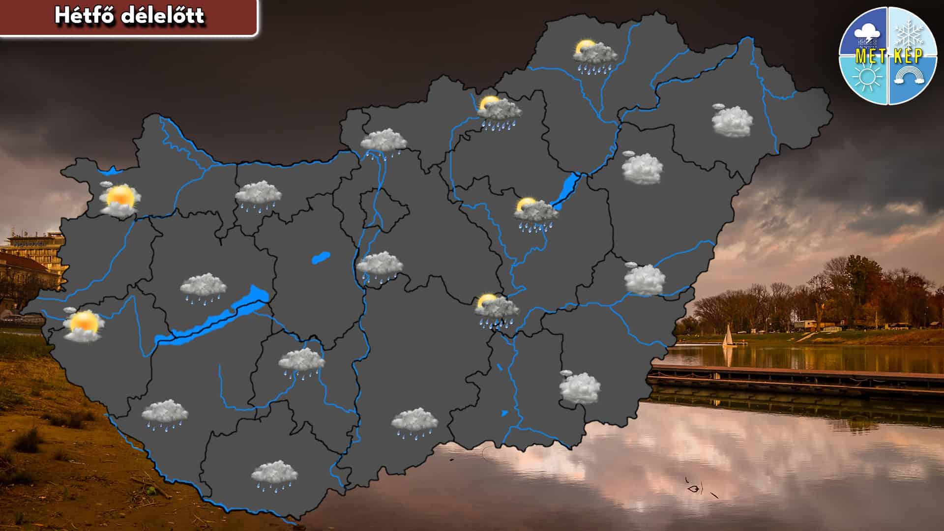 Többnyire erősen felhős, borult lesz az ég. A középső országrészben többfelé várható eső, zápor. Nyugat felől ugyanakkor fokozatosan megindulhat a felhőzet felszakadozása. Többfelé élénk, helyenként erős északnyugati szél lesz, az északnyugati tájakon viharos széllökések is előfordulhatnak.