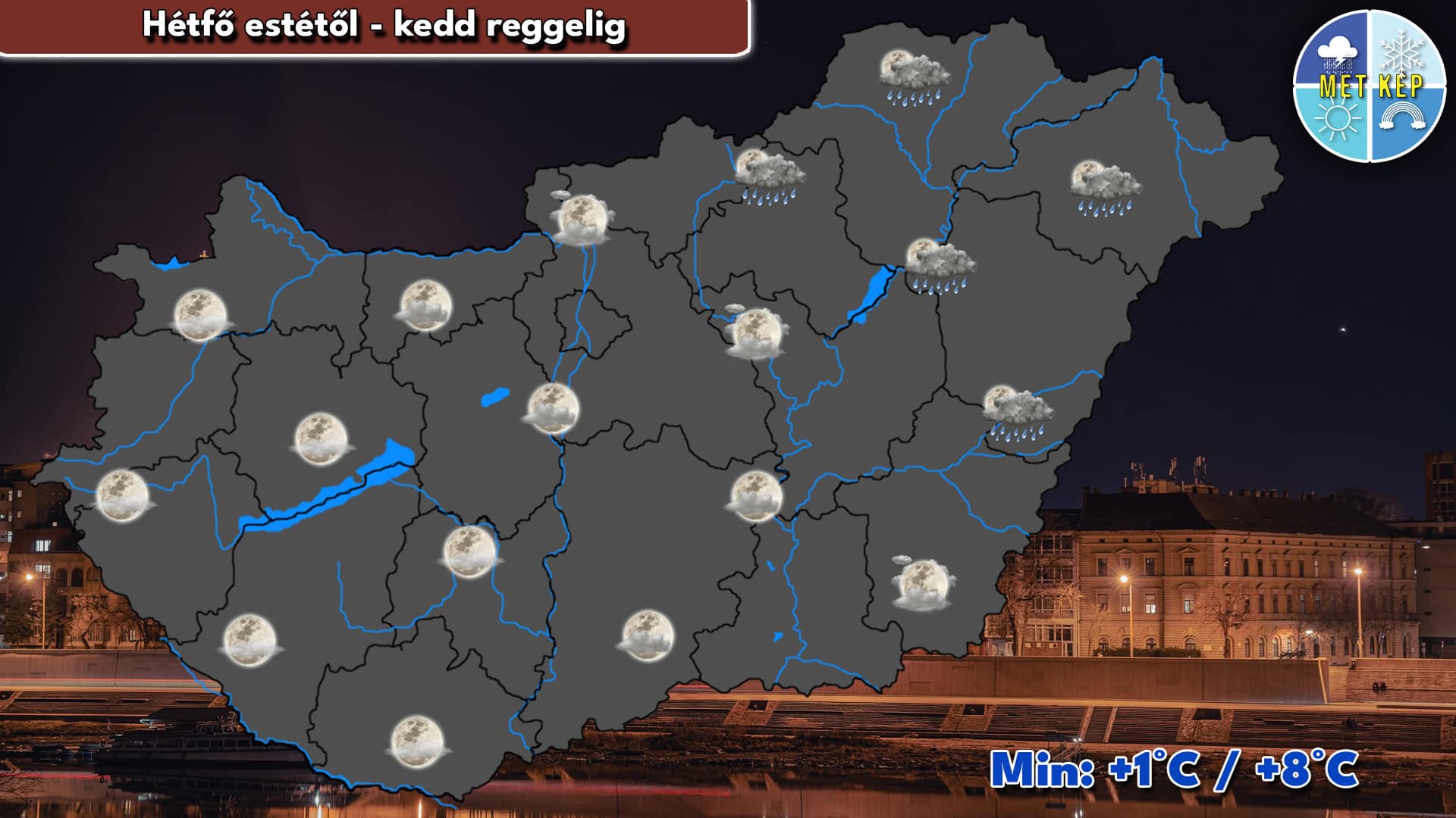 Az esti órákban északkeleten még lehet kisebb eső, zápor, később ott is megszűnik a csapadék. A Dunántúlon már derült vagy gyengén felhős lesz az ég. A szél többfelé mérséklődik, csak helyenként maradhat élénkebb. A legalacsonyabb hőmérséklet hajnalra 1 és 8 fok közé csökken.