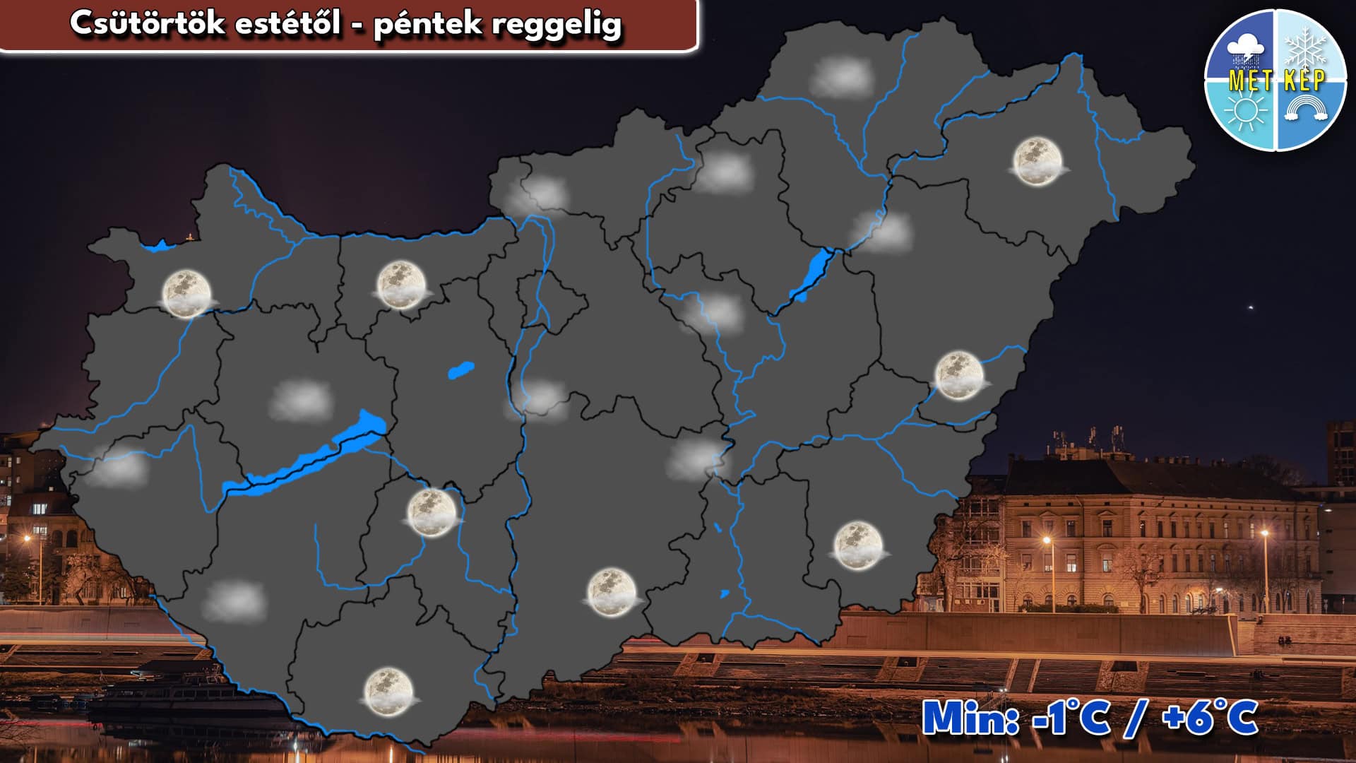 Az éjszaka folyamán többnyire derült, gyengén felhős lesz az ég. A hajnali órákra ismét pára és ködfoltok képződhetnek. Északnyugaton helyenként mérsékelt légmozgás várható. A minimum hőmérséklet –1 és +6 fok között alakulhat.