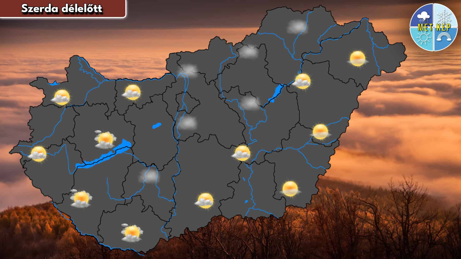 Az ország nagy részén közepesen vagy erősen felhős idő várható, helyenként pára és ködfoltok is kialakulhatnak. A Tiszántúlon több napsütésre számíthatunk, itt derült, gyengén felhős lesz az ég. A légmozgás gyenge lesz.
