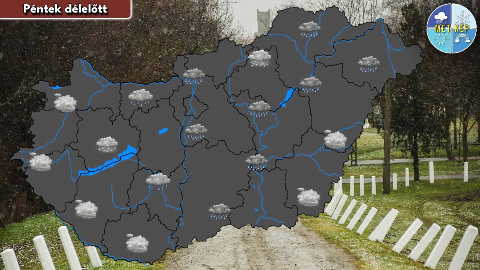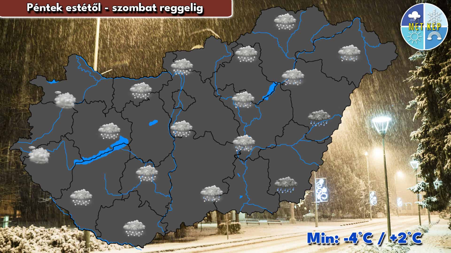 Az éjszaka során továbbra is jobbára borult idő valószínű. Az eső egyre többfelé havas esőbe, hóba válthat, síkvidéken is. Nyugaton és északkeleten a légmozgás élénk, helyenként erős vagy viharos lehet. A minimum hőmérséklet –4 és +2 fok között alakulhat.