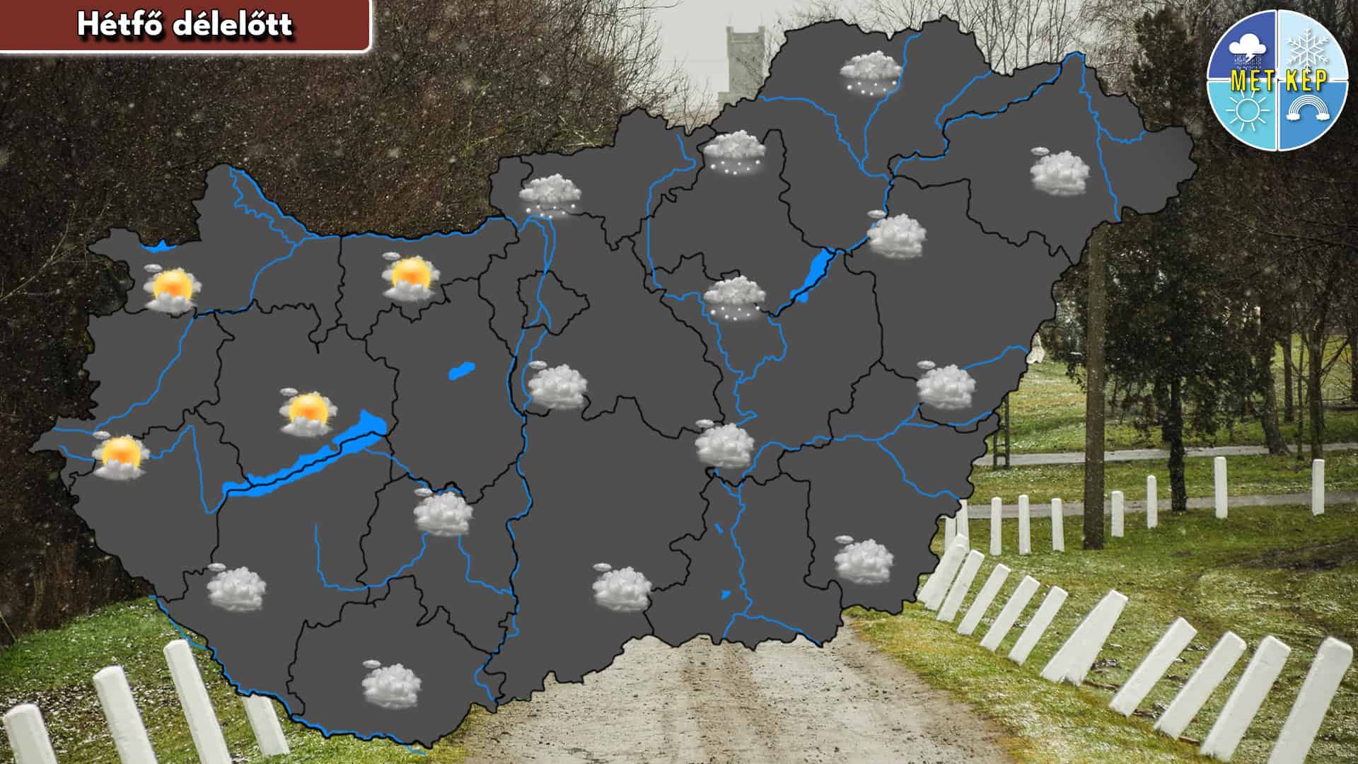 Jobbára erősen felhős, borult lesz az ég. Északon és északkeleten hószállingózás is kialakulhat. A légmozgás mérsékelt lesz, északnyugaton helyenként élénk széllökések kísérhetik.