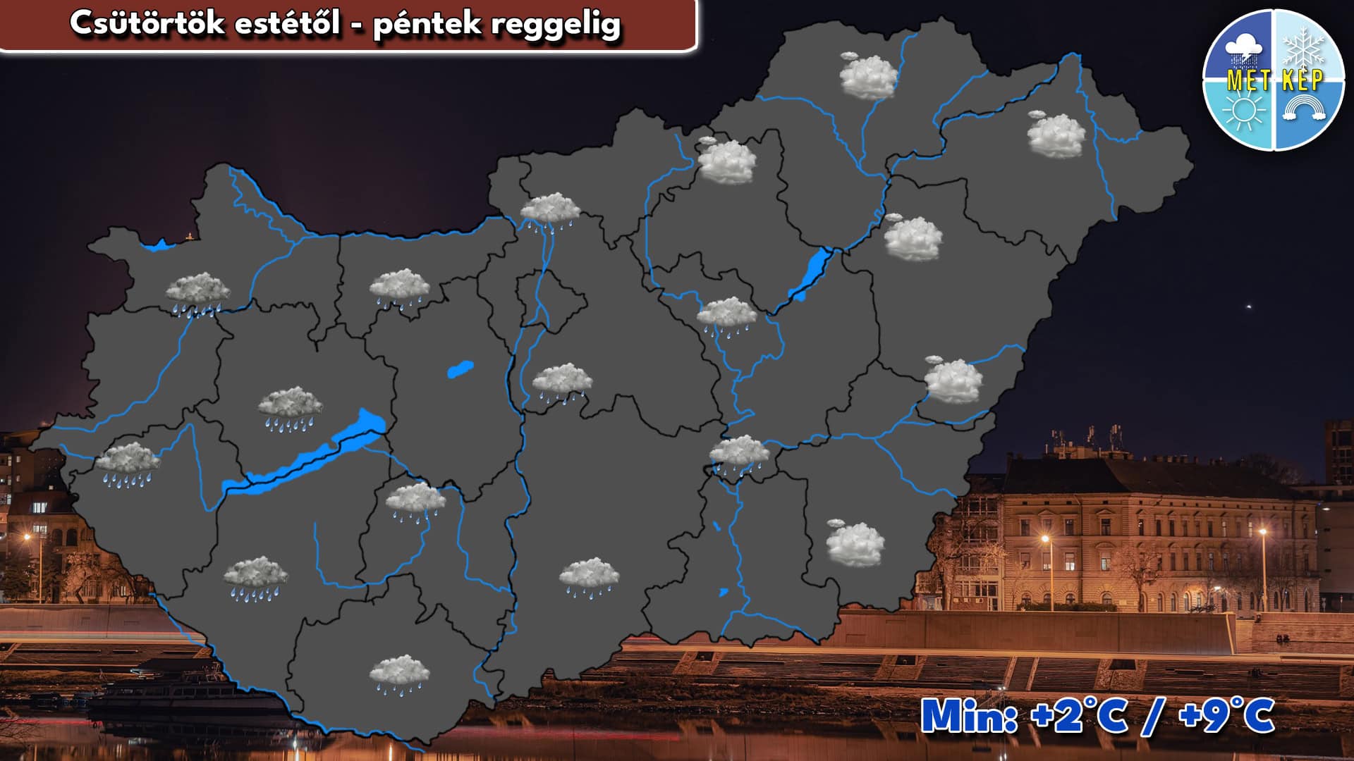 Éjszaka jobbára borult ég várható. A Dunántúlon és a középső országrészben eső, záporeső is előfordulhat. A légmozgás mérsékelt, helyenként élénk lehet. A minimum hőmérséklet 2 és 9 fok között alakulhat.