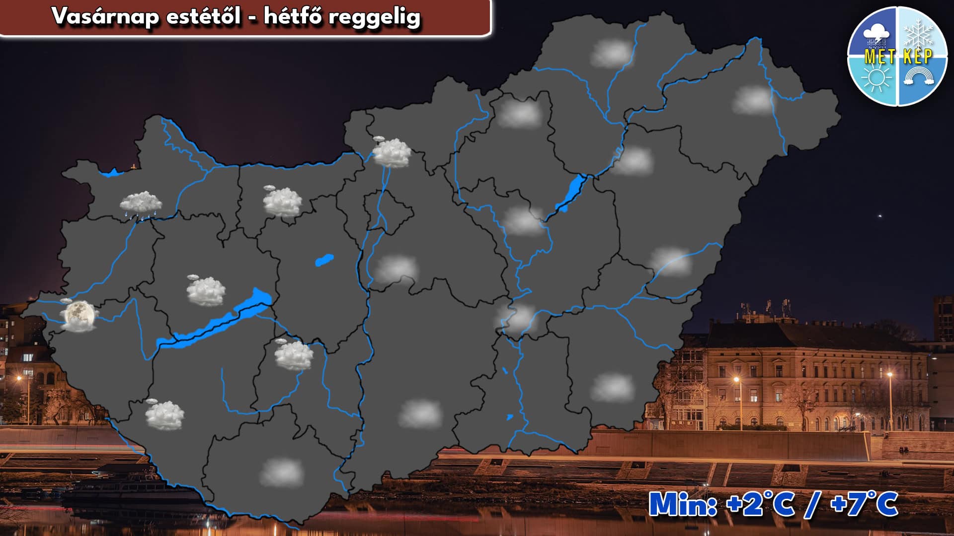 Túlnyomóan erősen felhős, borult időre készülhetünk. Sokfelé képződhet pára és köd, helyenként ködszitálás is lehet. A szél gyenge lesz. Hajnalban a minimum hőmérséklet 2 és 7 fok közé hűlhet.
