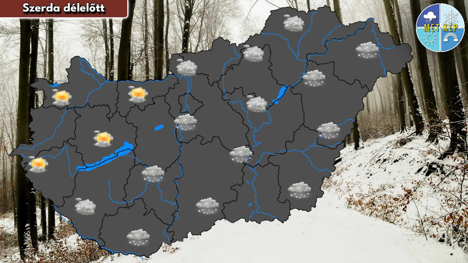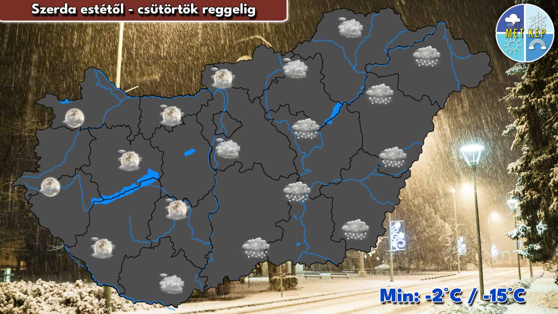 A Dunántúl nyugati felén szakadozni kezd a felhőzet, máshol jellemzően erősen felhős, borult égbolt valószínű. A szerda esti óráktól újabb csapadékzóna érkezik, amelyből a keleti térségekben kiterjedtebb havazás alakulhat ki. Mérsékelt, helyenként élénk lesz a légmozgás. Hajnalra a minimum hőmérséklet -2 és -15 fok közé süllyedhet, a derültebb nyugati tájakon mérhetjük az alacsonyabb értékeket.