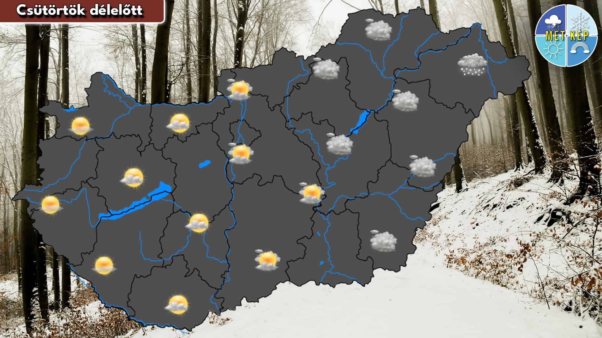Északkelet felé még előfordulhat havazás, míg másutt fokozatosan csökken a felhőzet. A Dunántúlon gyengén vagy közepesen felhős idő valószínű. Mérsékelt, többfelé élénk, helyenként erős lesz a légmozgás, a szelesebb tájakon hófúvás is kialakulhat. A legmagasabb hőmérséklet -1 és -7 fok között alakulhat.