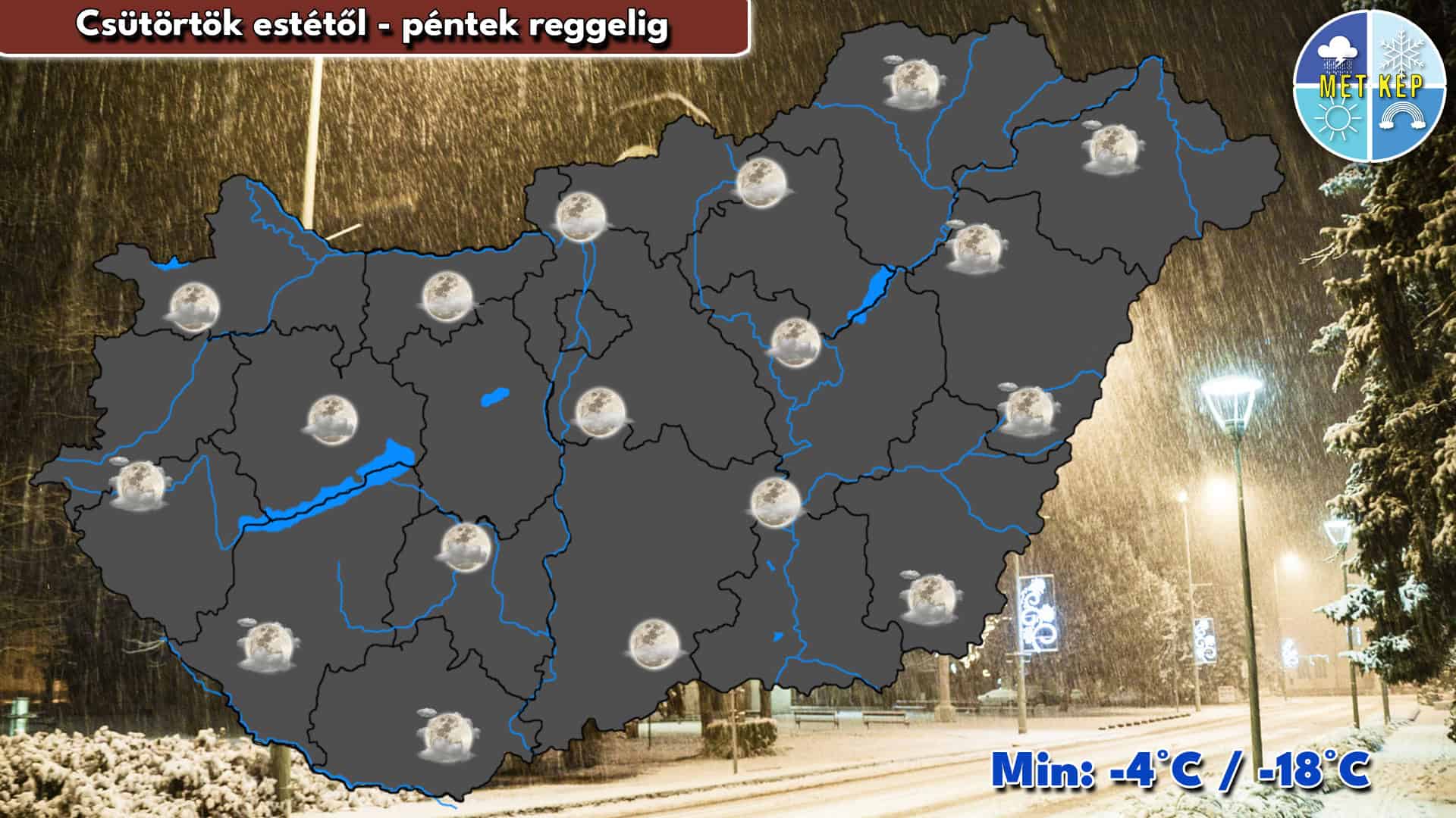 A középső országrészben derültebb lehet az ég, míg máshol közepesen vagy erősen felhős időre számíthatunk. Helyenként pára és ködfoltok is megjelenhetnek. Gyenge lesz a légmozgás. A minimum hőmérséklet -4 és -18 fok közé csökkenhet.