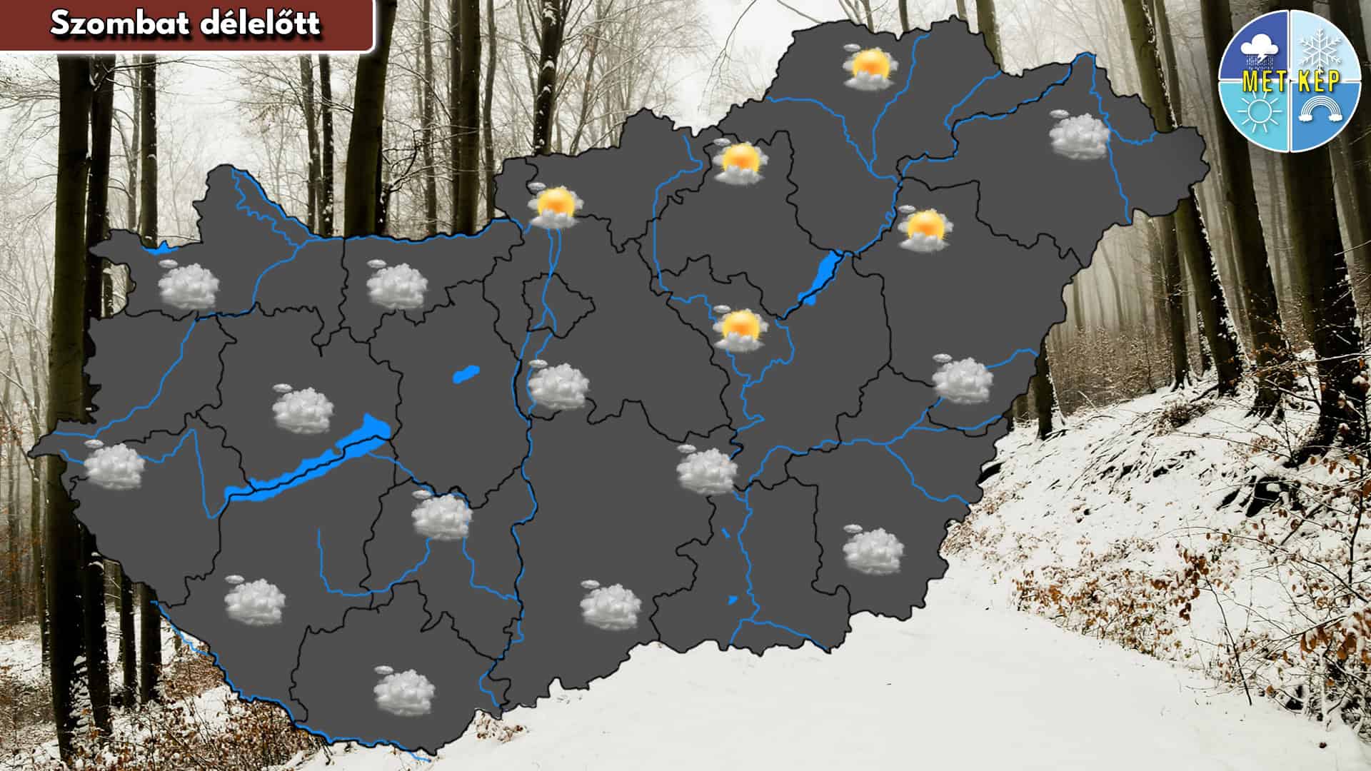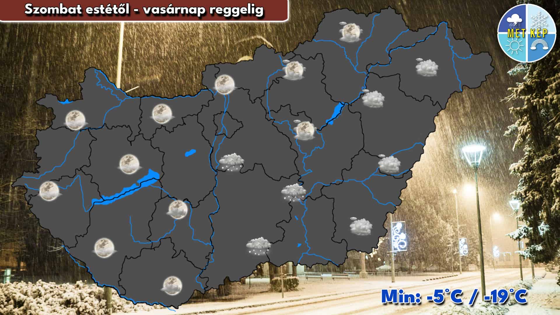 Szombatra virradó éjszaka északnyugat felől fokozatosan megszűnik a csapadék, ezzel párhuzamosan a felhőzet is szakadozni kezd. A Dunántúlon többfelé élénk lesz az északnyugati légmozgás, ezért hófúvás továbbra is előfordulhat. Hajnalra a minimum hőmérséklet -5 és -19 fok közé csökkenhet.