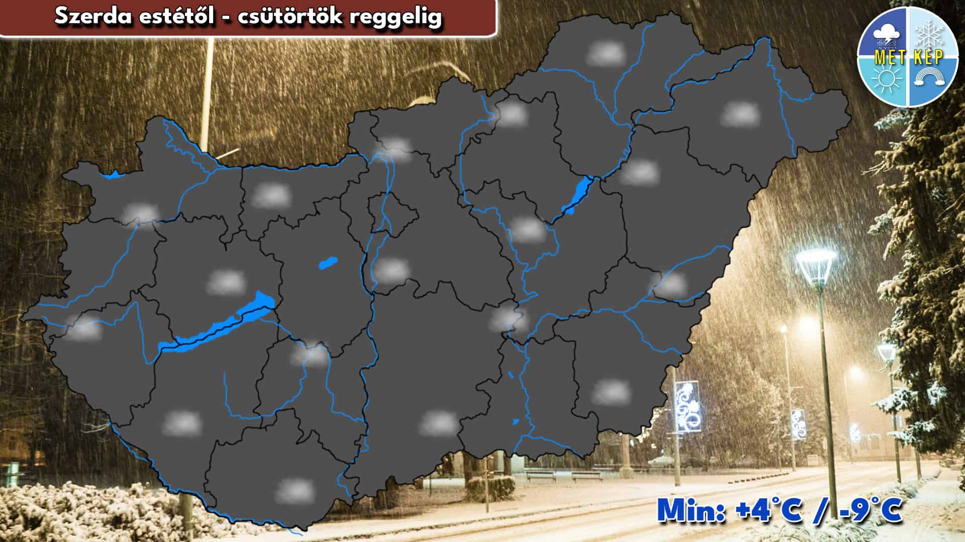 Éjszaka is megmarad a borult, ködös időjárás, szitálás és ónos ködszitálás továbbra is előfordulhat. A szél gyenge lesz. A hajnali minimum hőmérséklet +4 és -9 fok közé csökkenhet. Délnyugaton lesz az enyhébb idő.