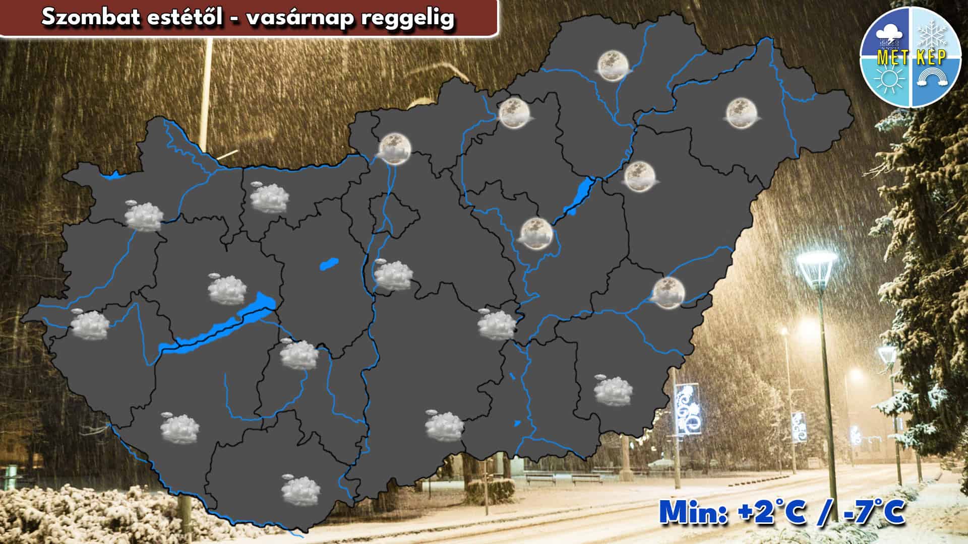 Vasárnapra virradó éjszaka északkeleten továbbra is derült, gyengén felhős idő ígérkezik, máshol viszont erősen felhős, borult maradhat az ég. Pára, ködfoltok kialakulása sem kizárt. A légmozgás helyenként mérsékelt lehet. A hajnali minimum hőmérséklet -1 és -16 fok között várható, a hidegebb értékek a derültebb északkeleti tájakon fordulhatnak elő.