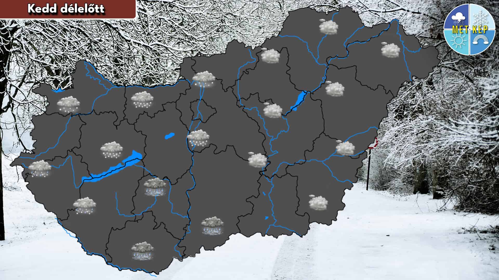 Az ország nagy részén borult lesz az ég. A Dunántúl déli tájain ónos esőre számíthatunk, amit majd a nap folyamán egyre inkább eső váltja fel. Az északibb területeken havazás lesz a jellemző, viszont ahogy érkezik az enyhébb levegő ezeken a területeken is átmeneti ónos eső válthatja fel a havazást. Általában mérsékelt, északnyugaton élénk lesz a légmozgás. A legmagasabb hőmérséklet -3 és +7 fok körül alakulhat.