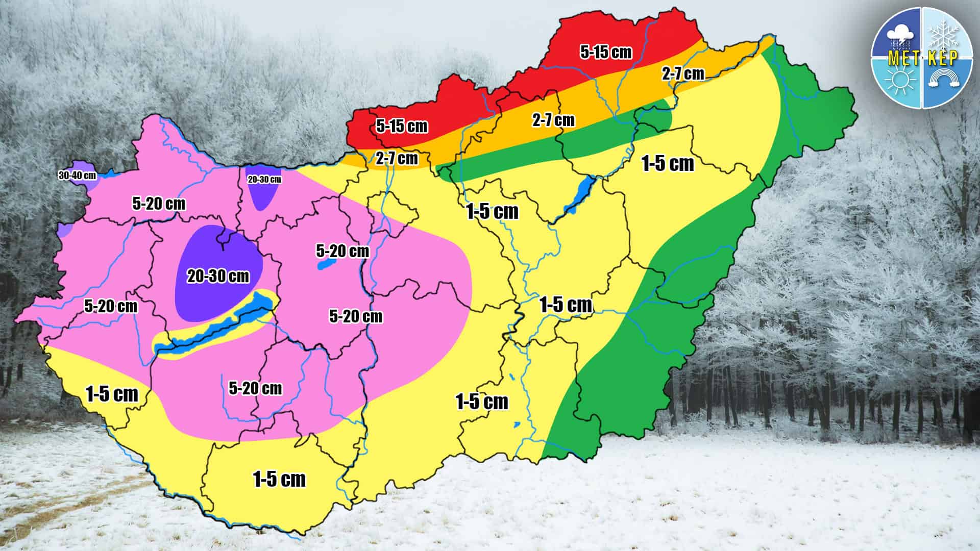 A legkevesebb hóra délkeleten van esély, a határ mentén valószínűleg csak látványhavazás lesz, esetleg lepelnyi hó hullhat. A Dunántúl nagy részén 15-20cm hótakaró alakul ki, az Északi-középhegységben pedig 30cm körüli.