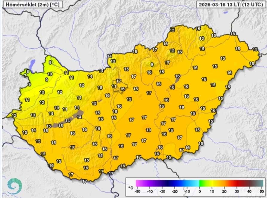 Ma érkezik a hideg levegő első hulláma. A középső területeken, Pécs-Hatvan vonalon záporok, kis eséllyel zivatar is kialakulhat, de zömében még tavaszi meleg lesz, 15-19 fok. Ugyanakkor nyugatra már beért a hidegebb levegő és sokféle 10 fok alatti hőmérsékleteket mérhetünk. A Kendig-csúcson már havas eső, hó esik és csupán 2 fok van. Erős kontraszt nyugat és kelet között.