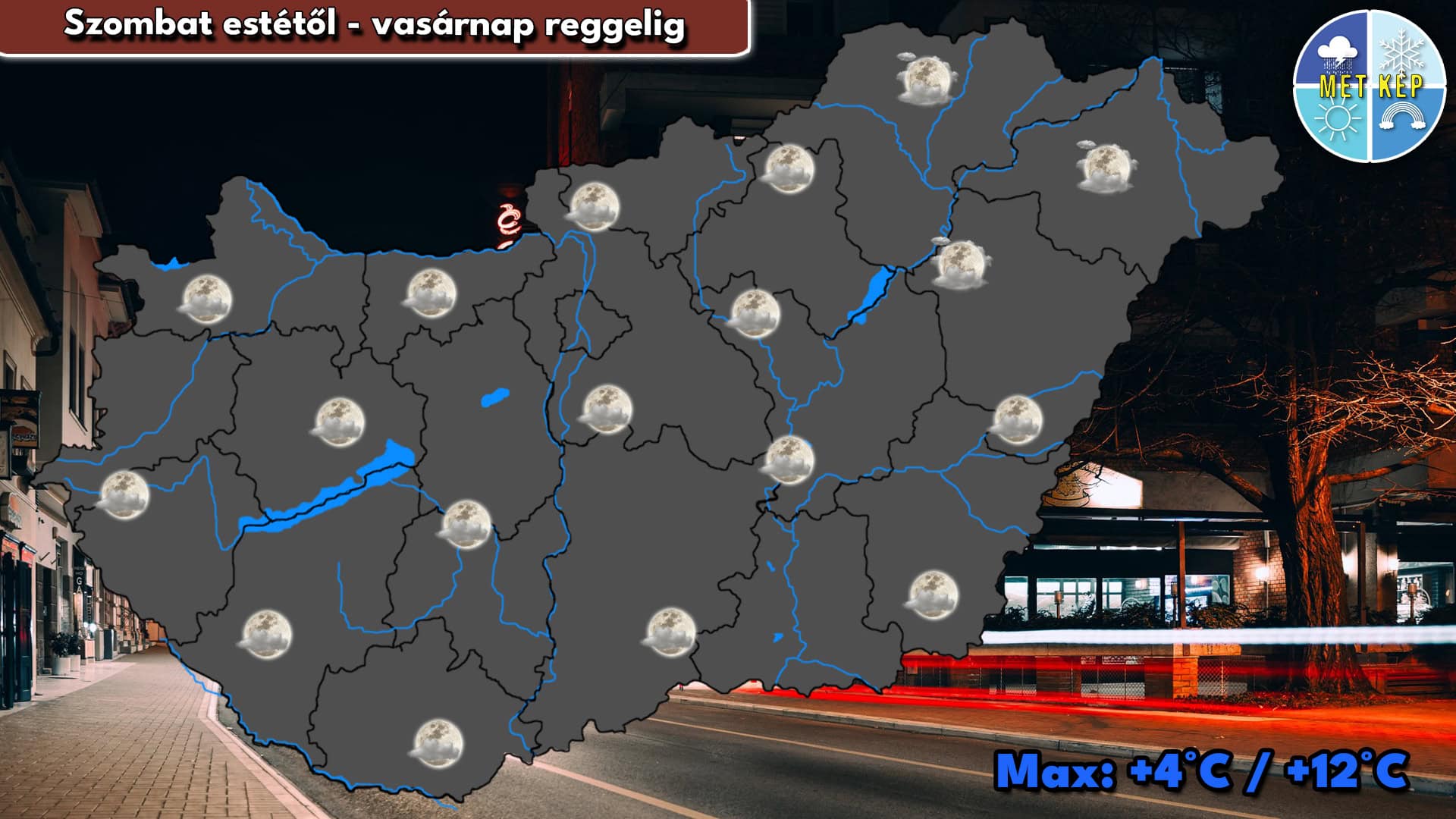 Az éjszakai órákban közepesen, időnként erősen felhős lesz az ég. Egyes helyeken mérsékelt légmozgás alakulhat ki. A hőmérséklet +4 és +12 fok körül alakulhat.