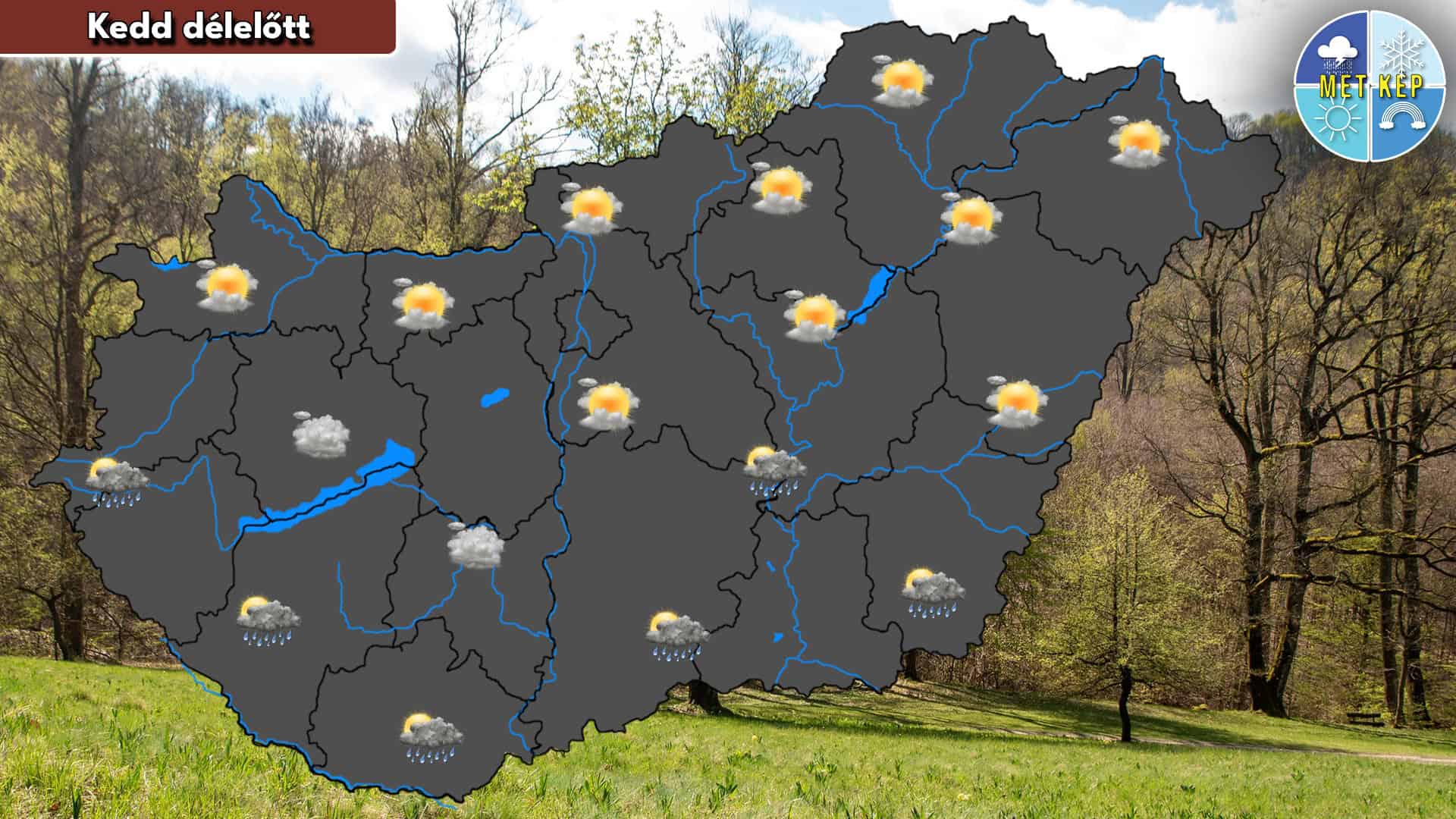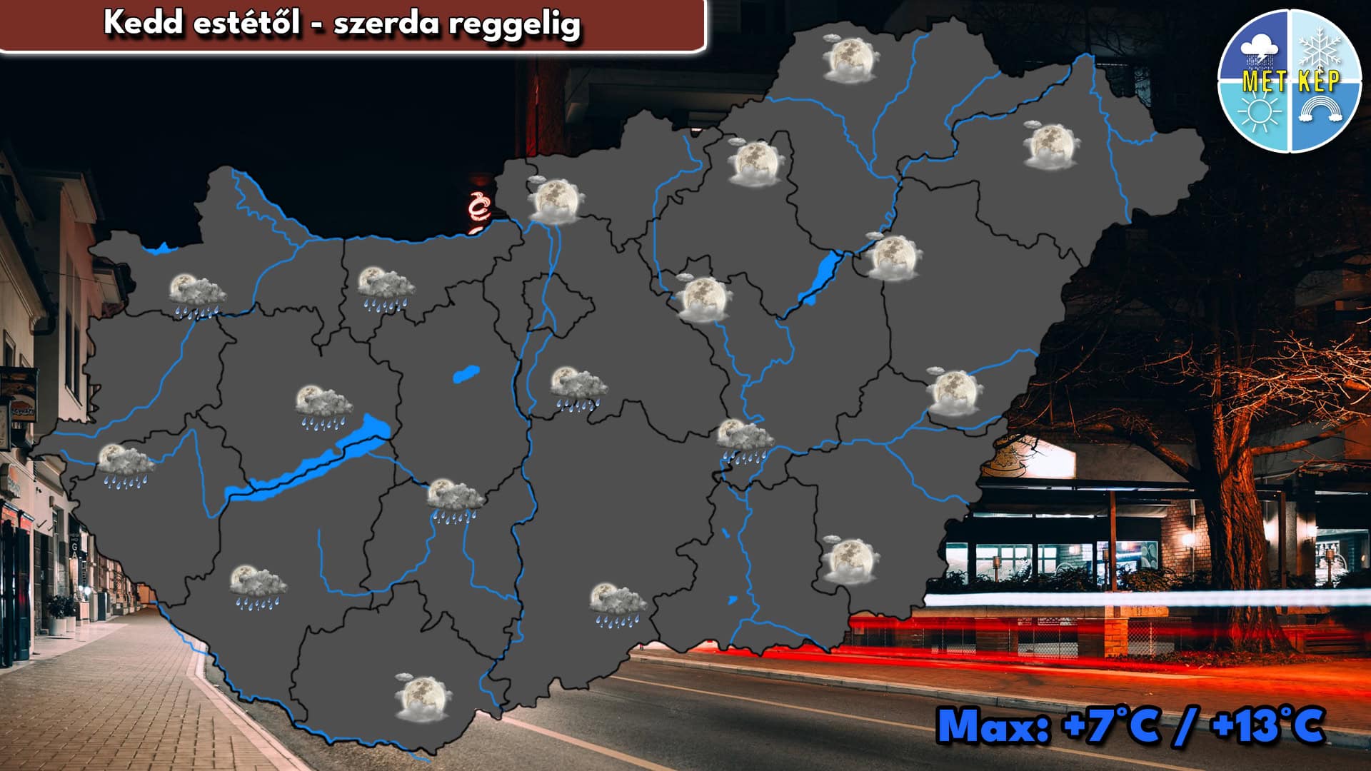 Erősen felhős, borult lesz az ég. A középső országrészben és északnyugaton elszórtan eső, zápor is előfordulhat. Helyenként mérsékelt légmozgás alakulhat ki. Az éjszakai fagyok megszűnnek, a hőmérséklet +7 és +13 fok körül alakulhat.